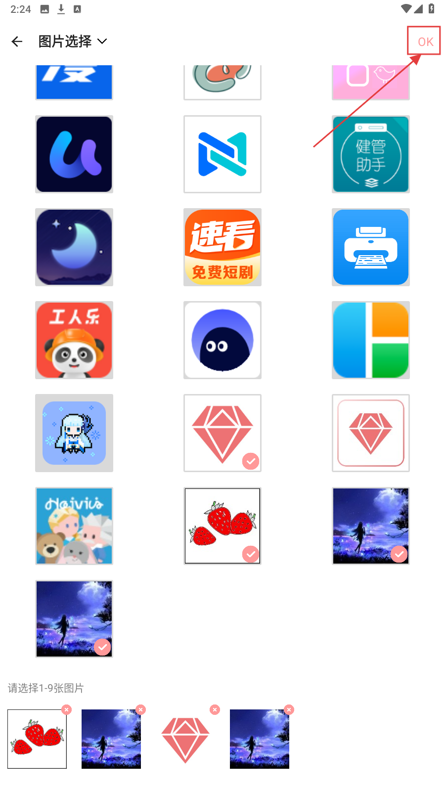 2、在图片选择页面,从众多图片中挑选1-9张,选好后点击右上角【OK】按钮进入下一步。