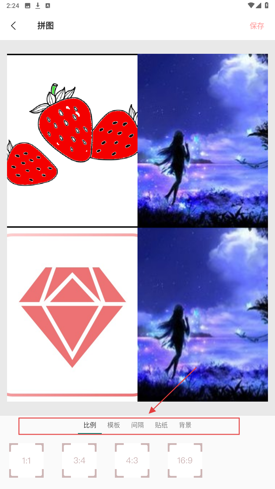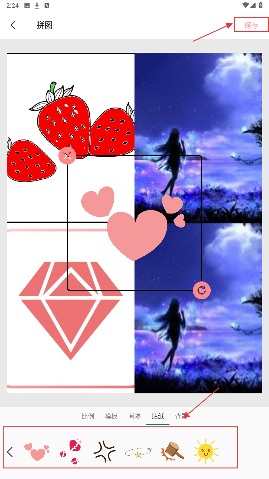 4、添加【贴纸】等装饰元素后,点击右上角【保存】按钮,将精心制作的拼图保存下来。