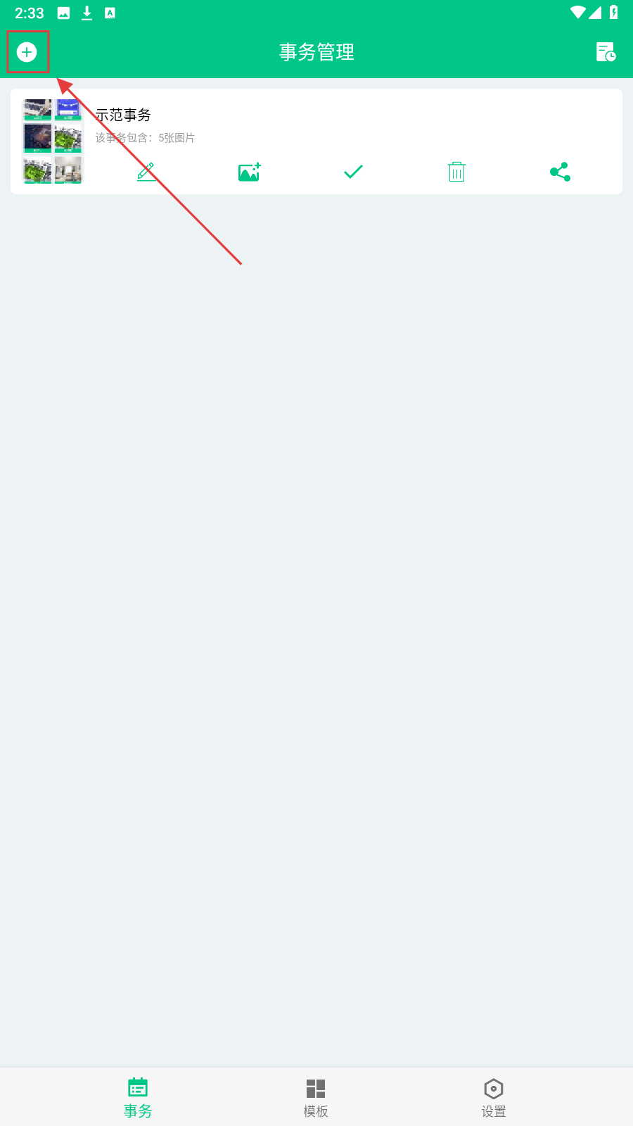 1、进入【事务管理】界面,点击左上角加号按钮,即可开启新增事务的操作流程。