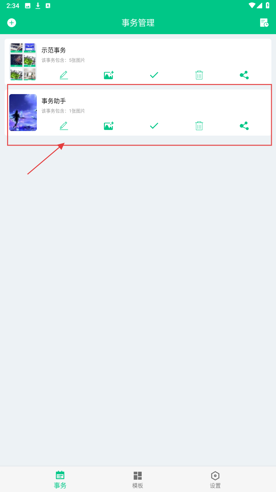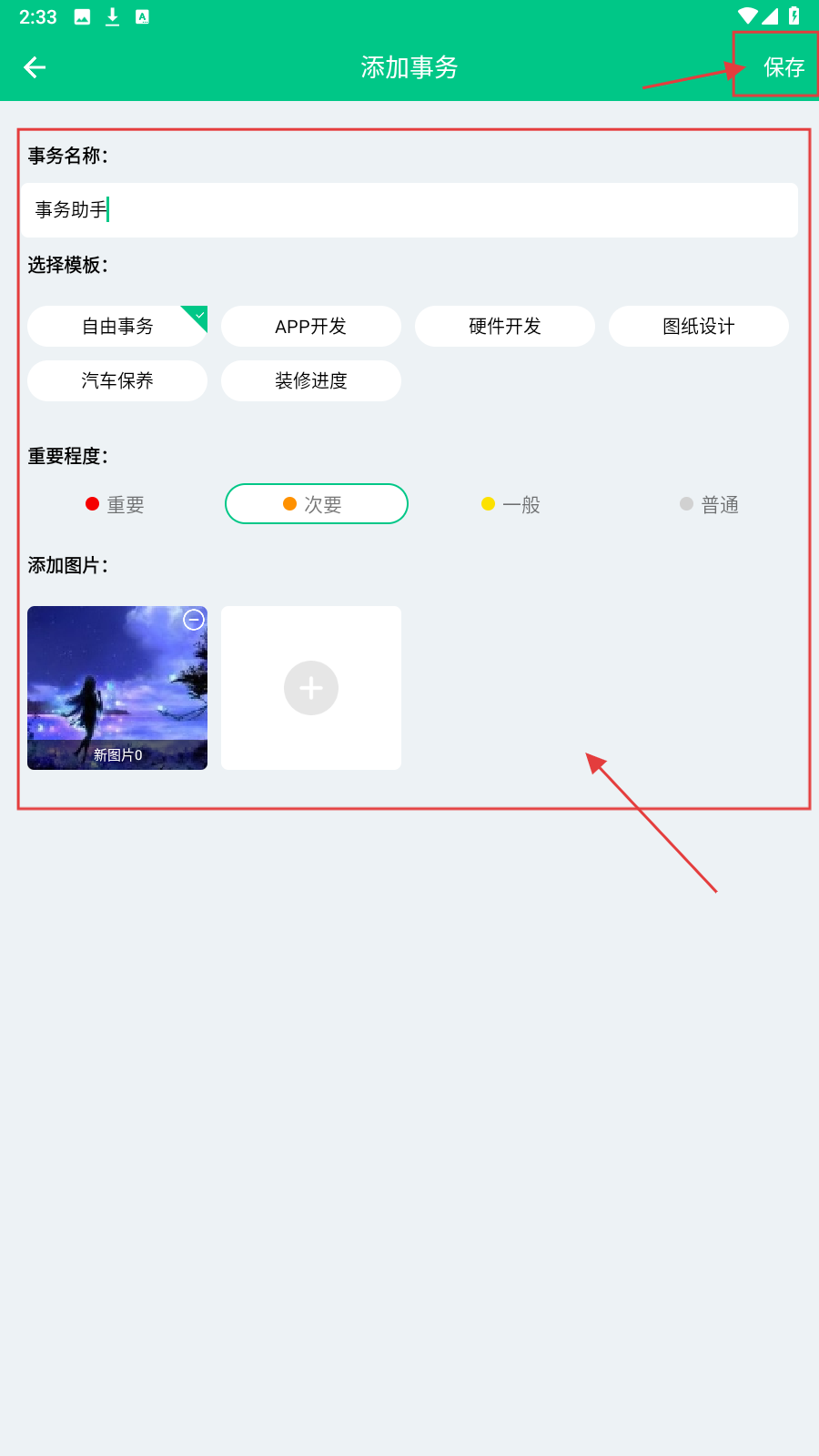 2、在【添加事务】页面,填写事务名称,选定模板与重要程度,添加图片后点击保存。