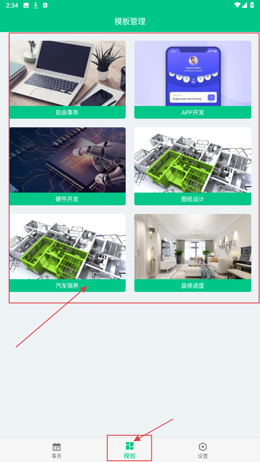 4、点击底部模板按钮,进入【模板管理】页面,可挑选自由事务、APP开发等多种模板类型。