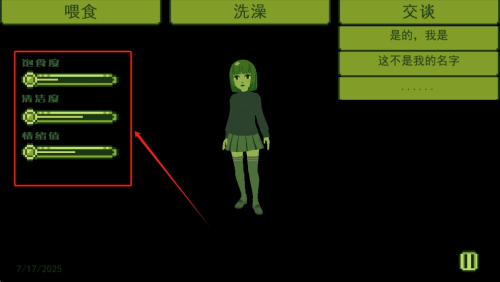 1、日常与女孩互动,主动发起对话了解她的想法,按需求为她准备食物、清洁身体,维持食物、卫生、心情三个元素的良好状态。