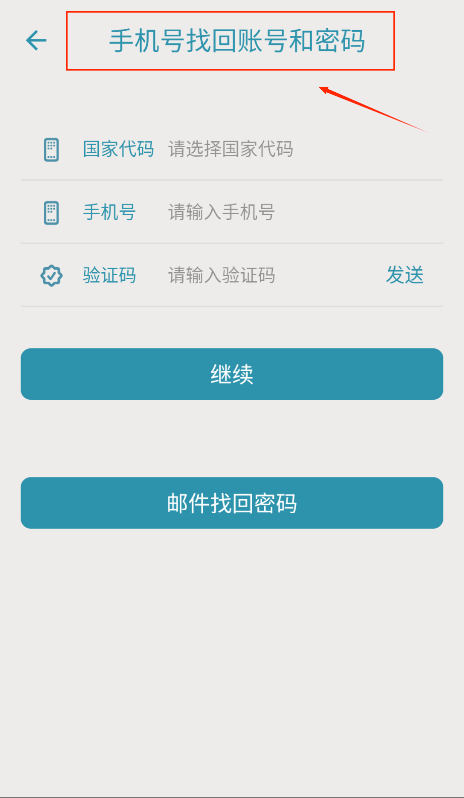 2、在找回密码页面选择"手机号找回"方式,先选择国家代码再输入完整手机号,获取并填写验证码后点击继续哦。