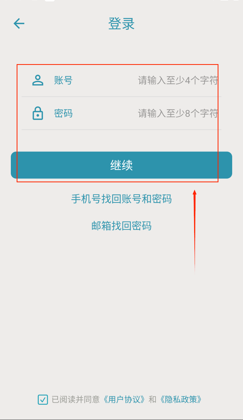 3、登录时在账号框输入4位以上用户名,密码框输入8位以上密码,勾选同意协议后点击蓝色继续按钮啦。
