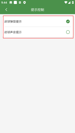 4、进入提示控制页面后,可看到进球弹窗提示、进球声音提示的开关,按需开启或关闭对应提示功能。