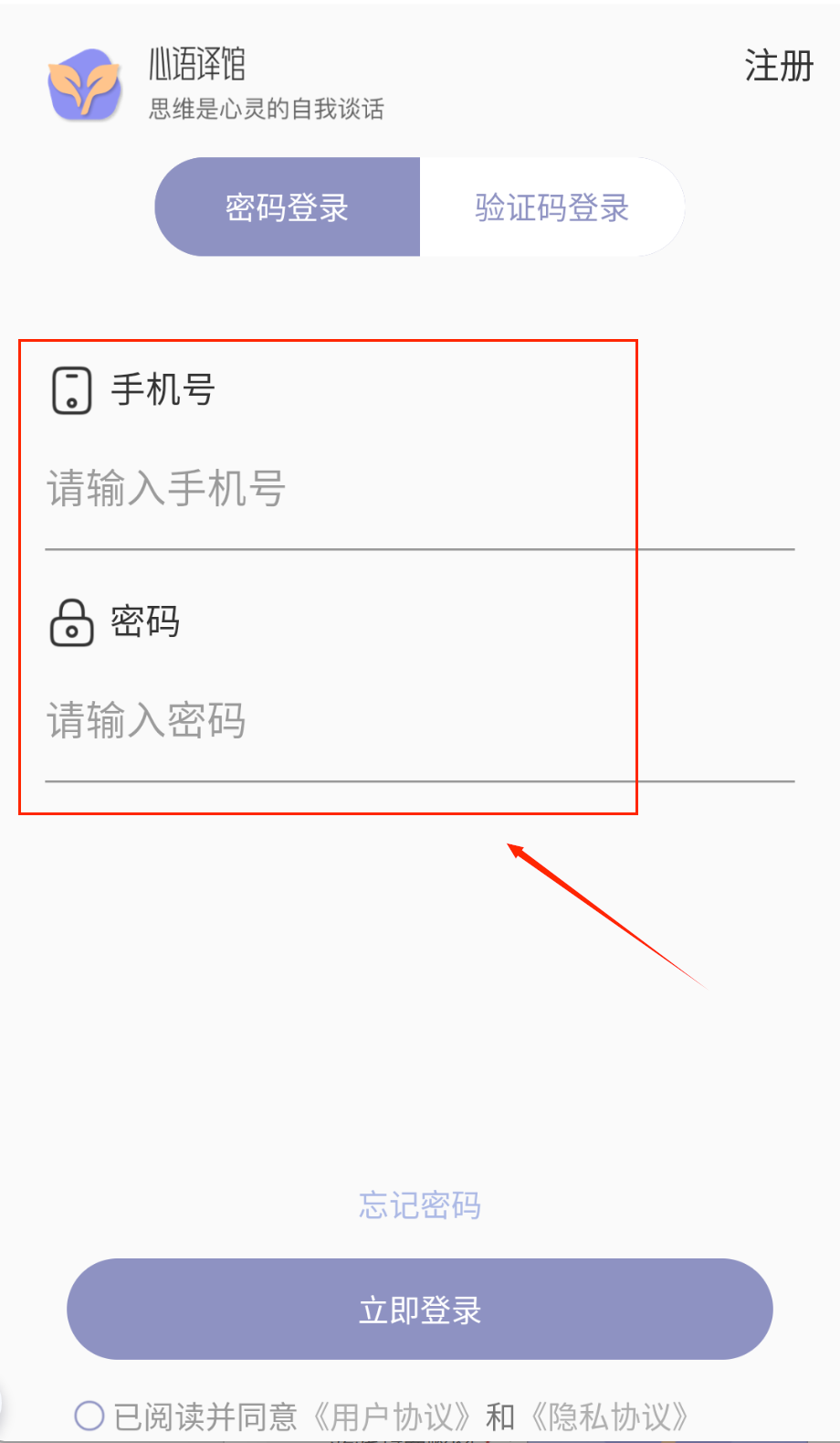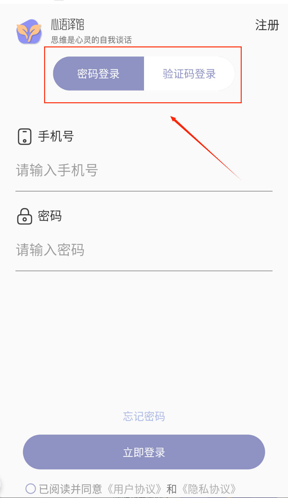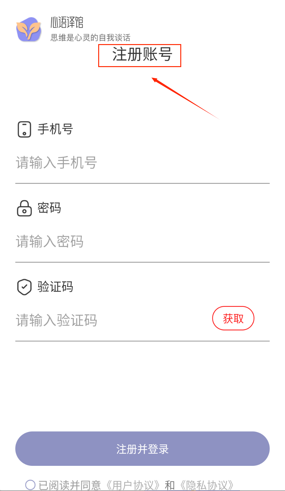 1、打开APP进入注册页面,输入手机号获取验证码,设置8-16位含字母数字的密码,勾选同意协议后点击紫色注册按钮哦。