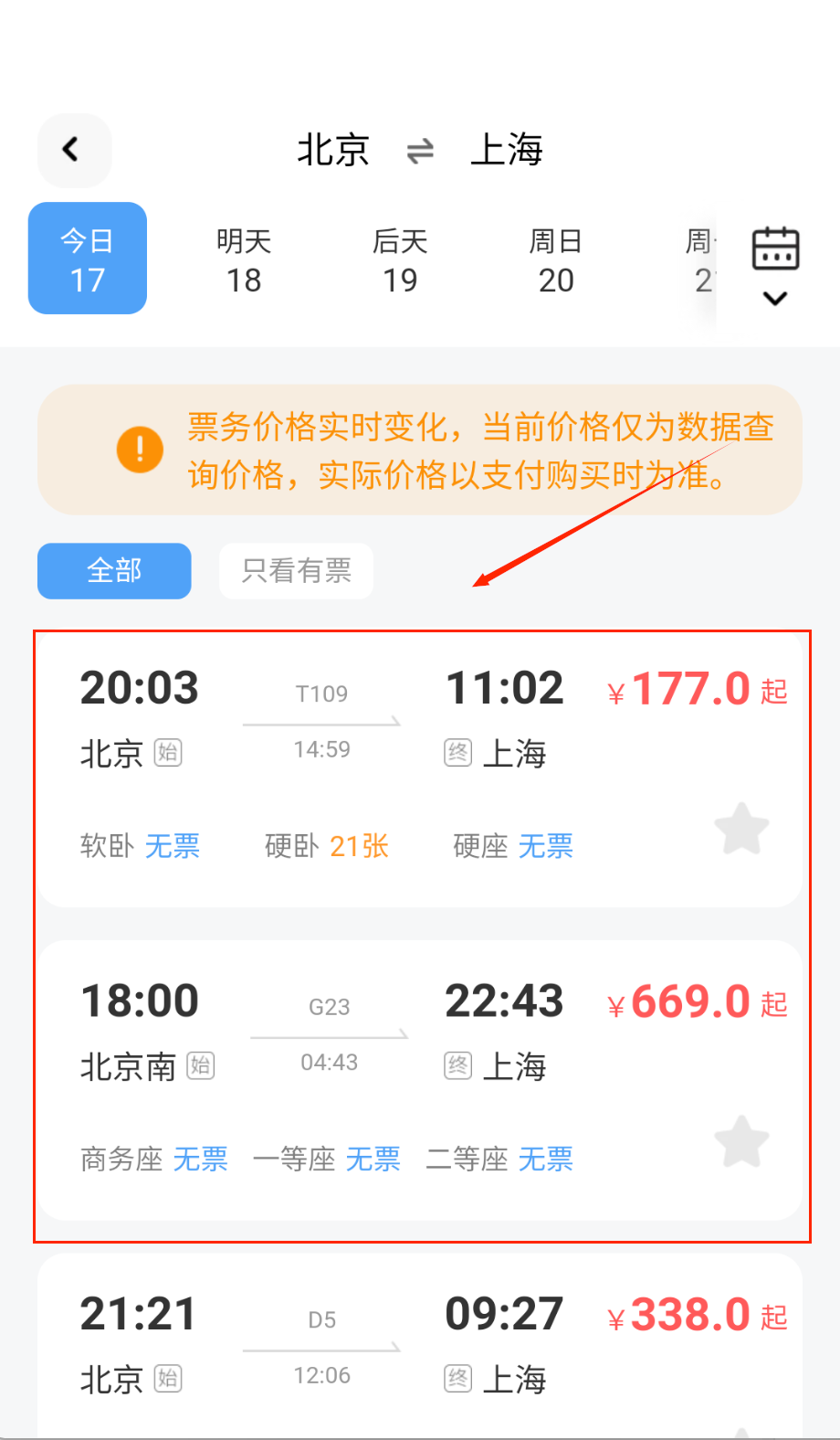 2、车次页对比不同时段价格,收藏心仪车次设置降价提醒,开启自动抢票功能啦。