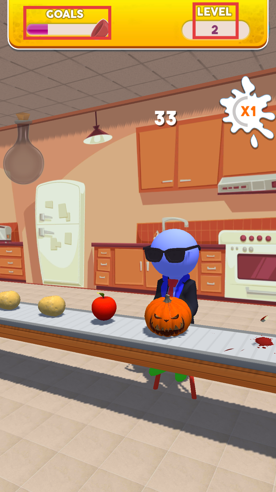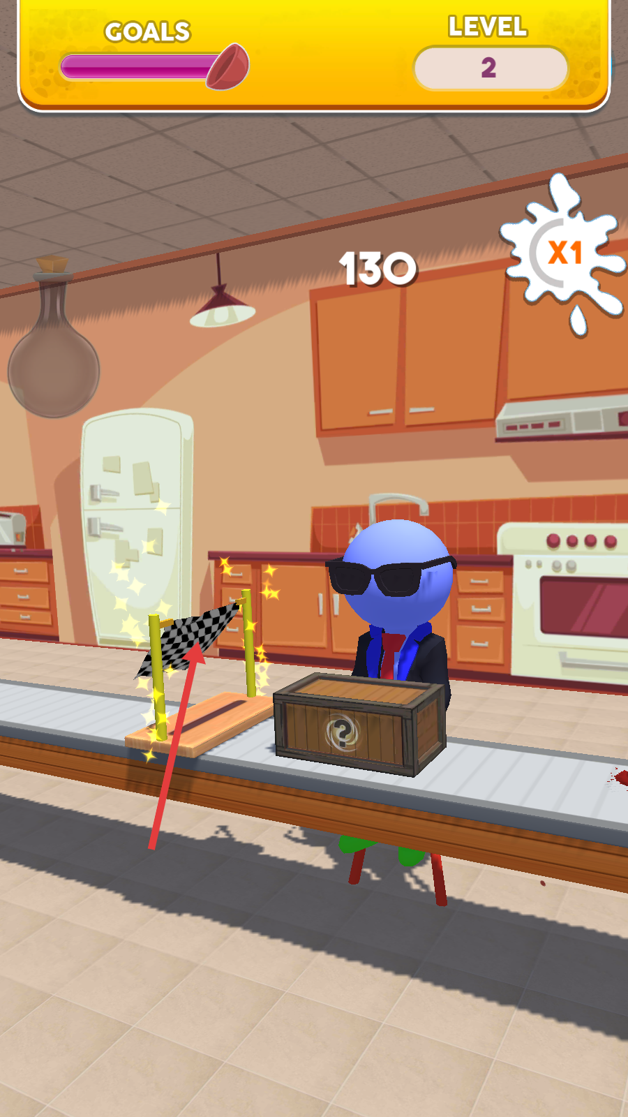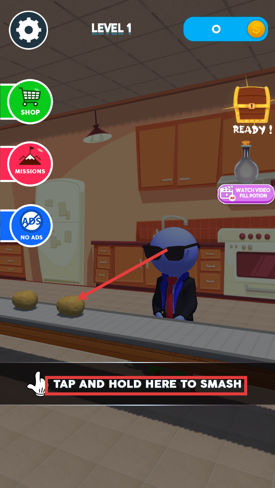 1、看到屏幕提示【TAP-AND-HOLD-HERE-TO-SMASH】,按住相应位置击碎传送带上的物品,获取分数。
