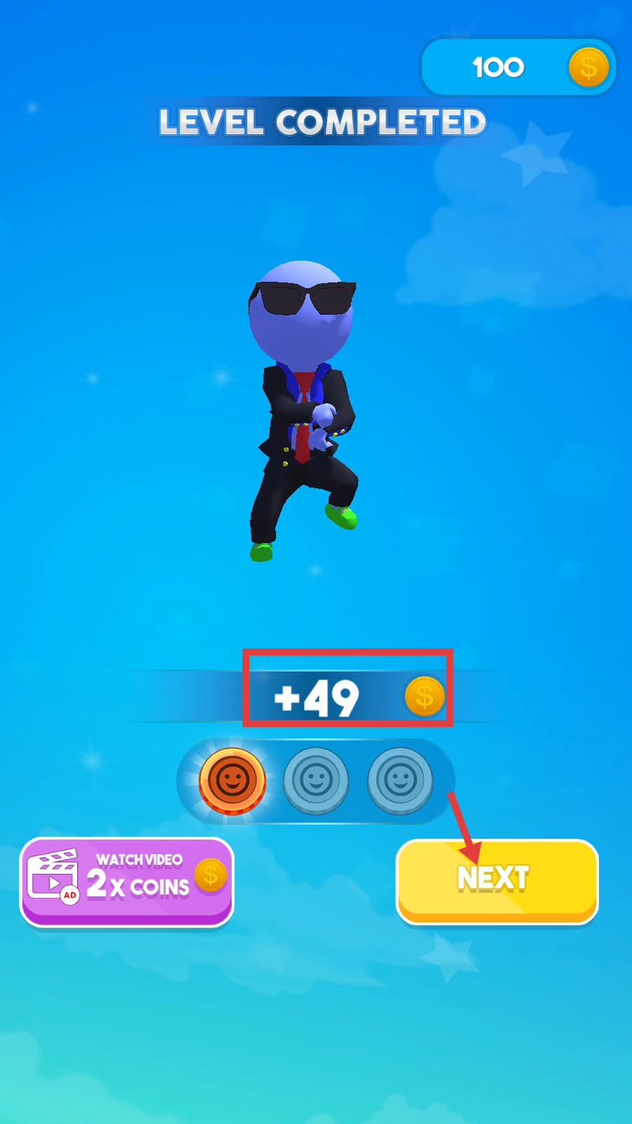 4、成功完成关卡后,查看获得的金币奖励,可选择观看视频获取双倍金币,或点击【NEXT】进入下一关卡。