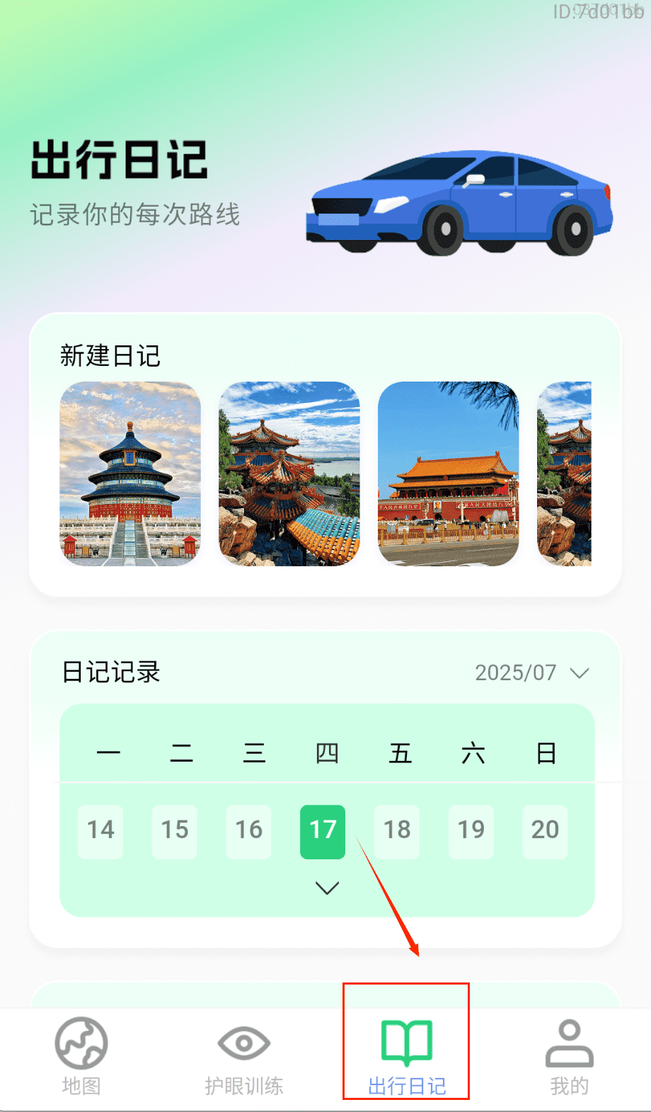 4、在出行日记页面会自动记录每次导航轨迹,支持添加沿途拍摄的照片和文字备注,最后可以生成精美的旅行足迹图文一键分享给社交好友哦。