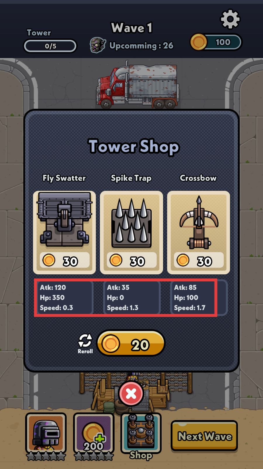 1、开局有100金币,可按需从【Tower-Shop】购买【Fly-Swatter】【Spike-Trap】【Crossbow】防御塔。