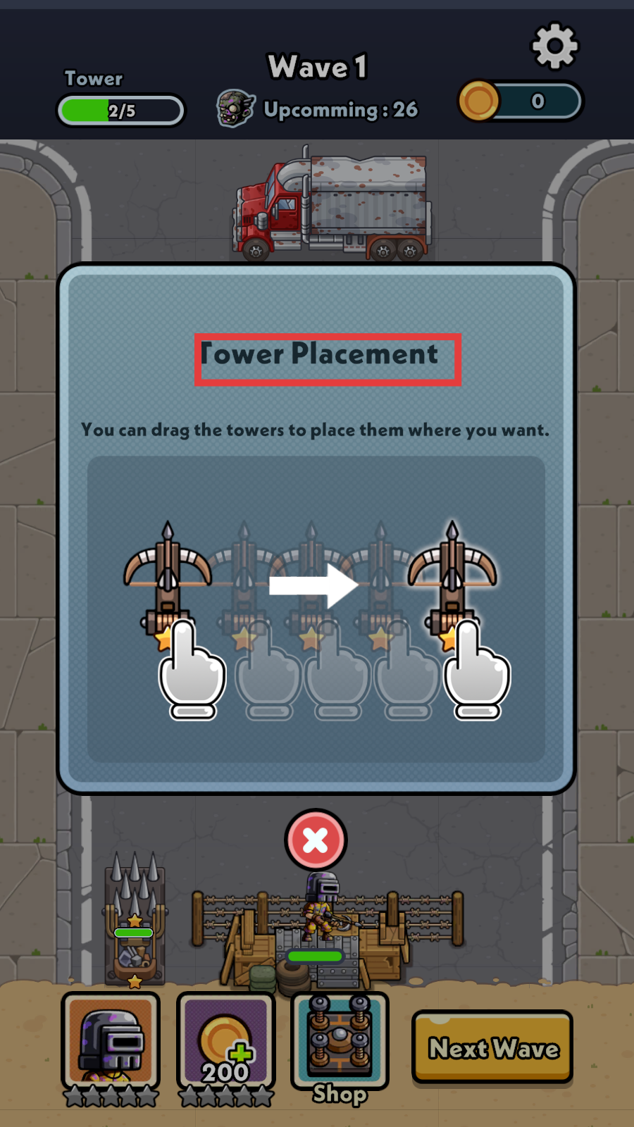 2、购买后,通过【Tower-Placement】提示,拖动防御塔至合适位置抵御敌人。