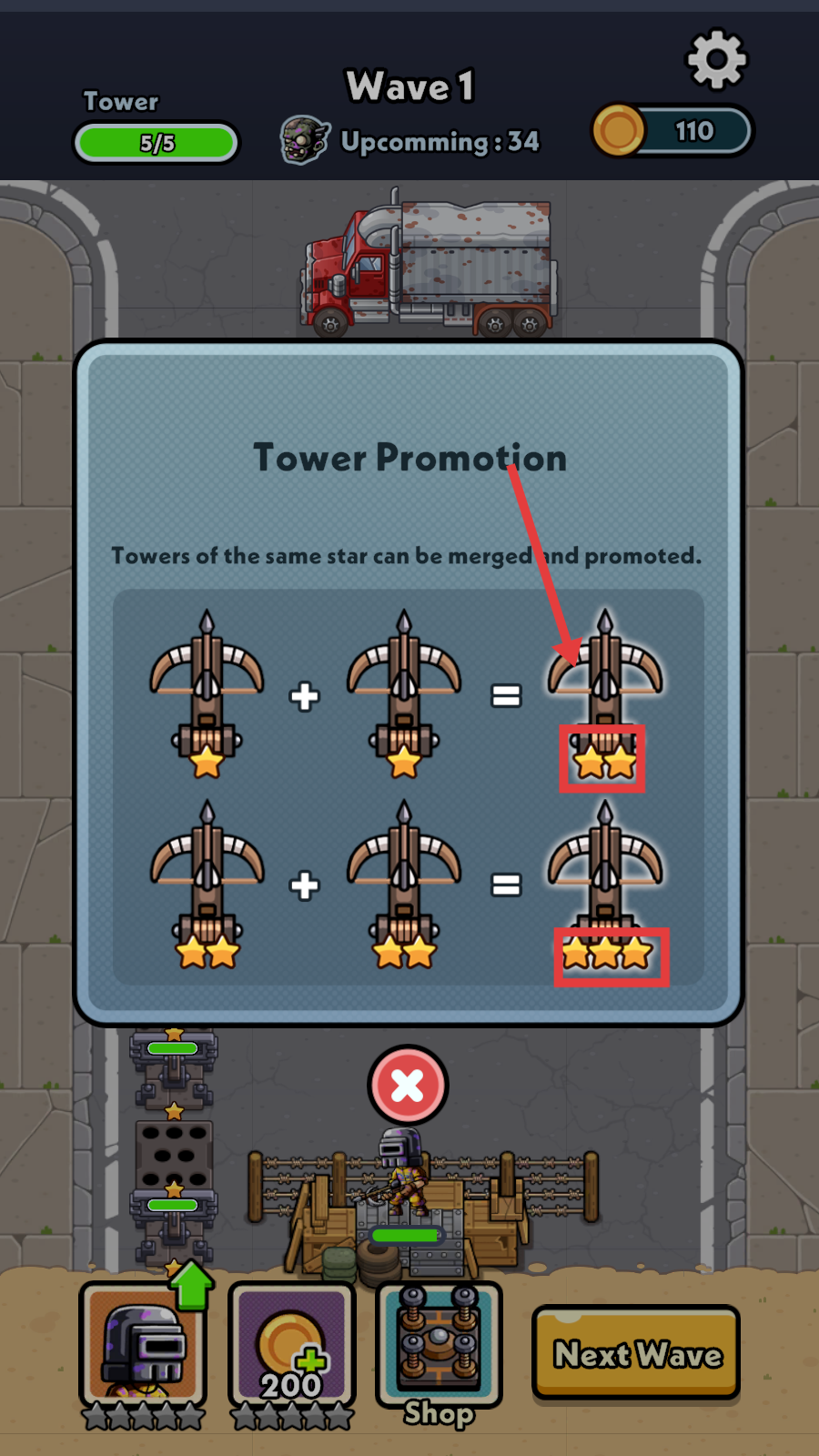 4、相同星级的防御塔可依据【Tower-Promotion】提示进行合并升级,提升防御能力。
