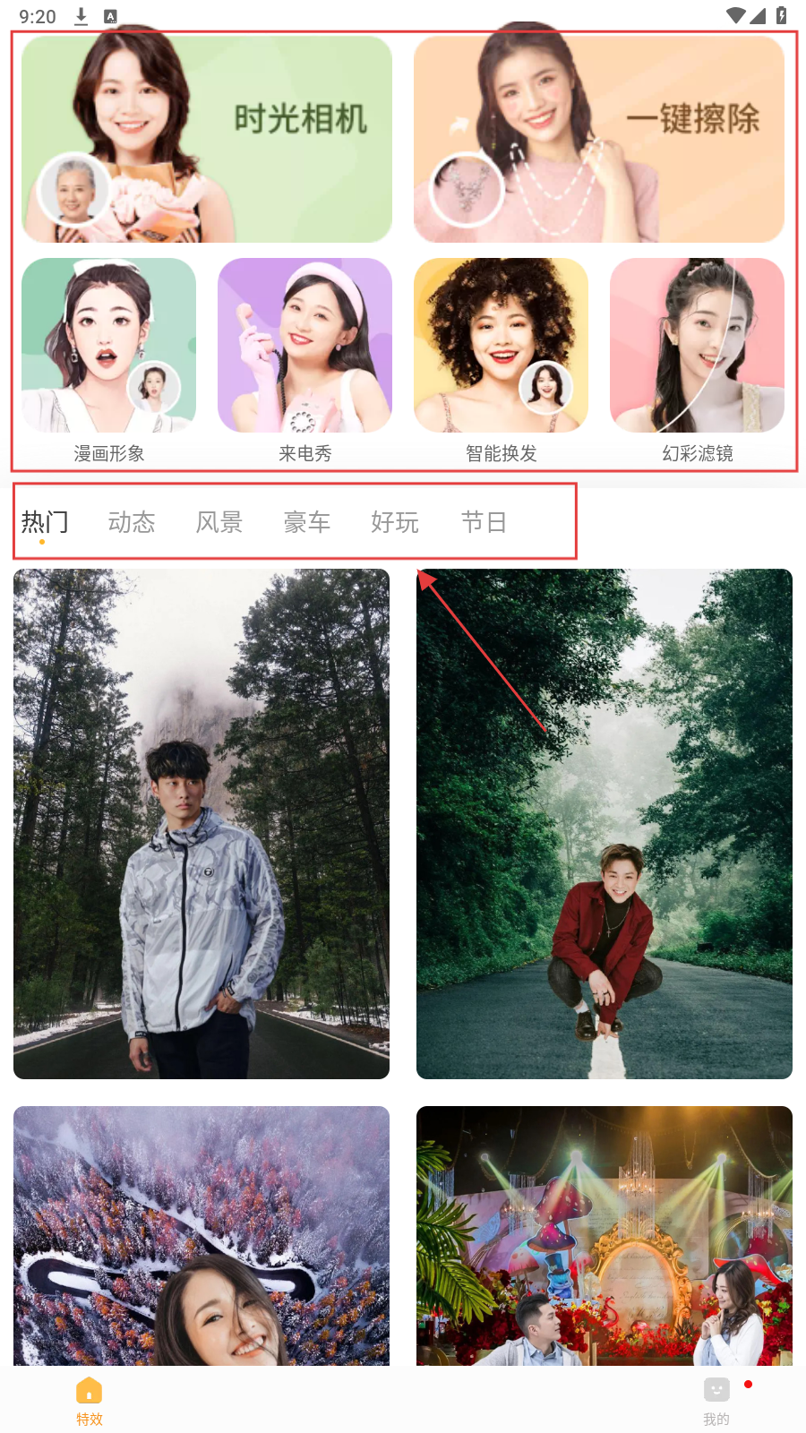 1、在特效页面,可使用【时光相机】【一键擦除】等特效功能,还能选择不同分类查看图片。