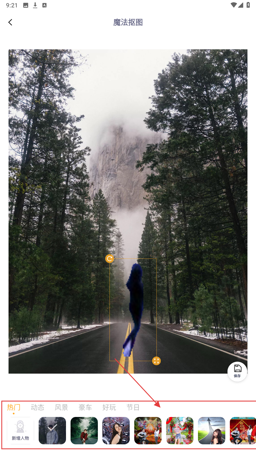 4、选择合适的背景图片后,可调整人物位置和大小,完成后点击【保存】即可保存修改后的图片。