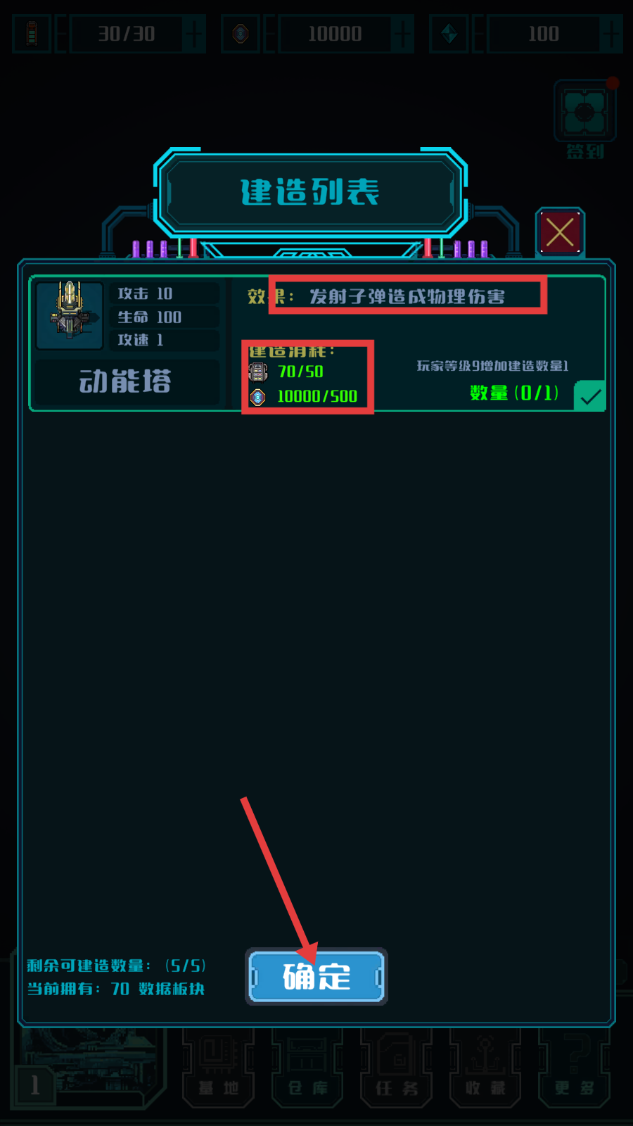 2、在【建造列表】中,了解【动能塔】属性,确认【建造消耗】满足条件后,点击【确定】进行建造。