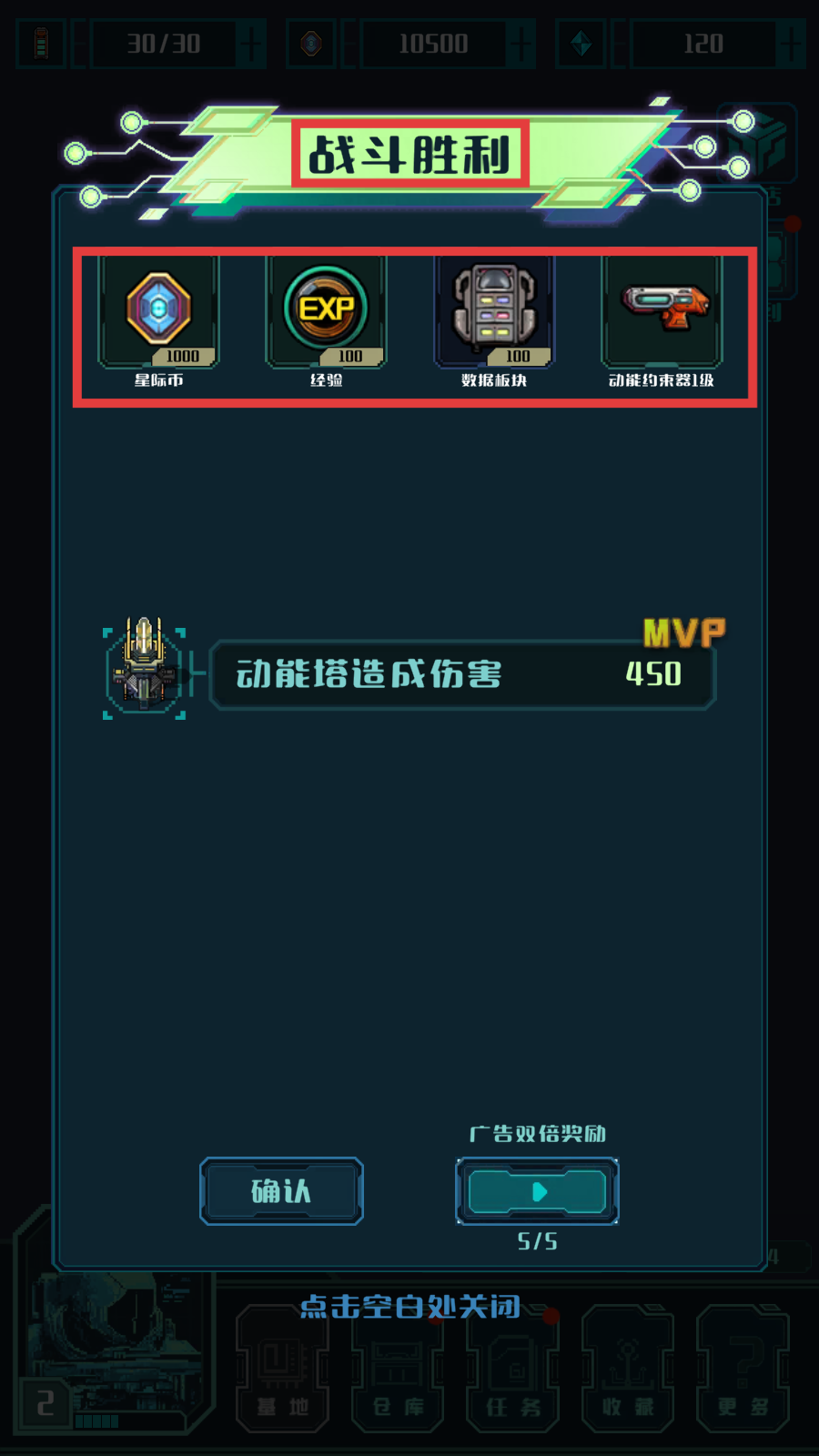 4、战斗胜利后,领取【星际币】【经验】【数据板块】【动能约束器1级】等奖励,提升实力。