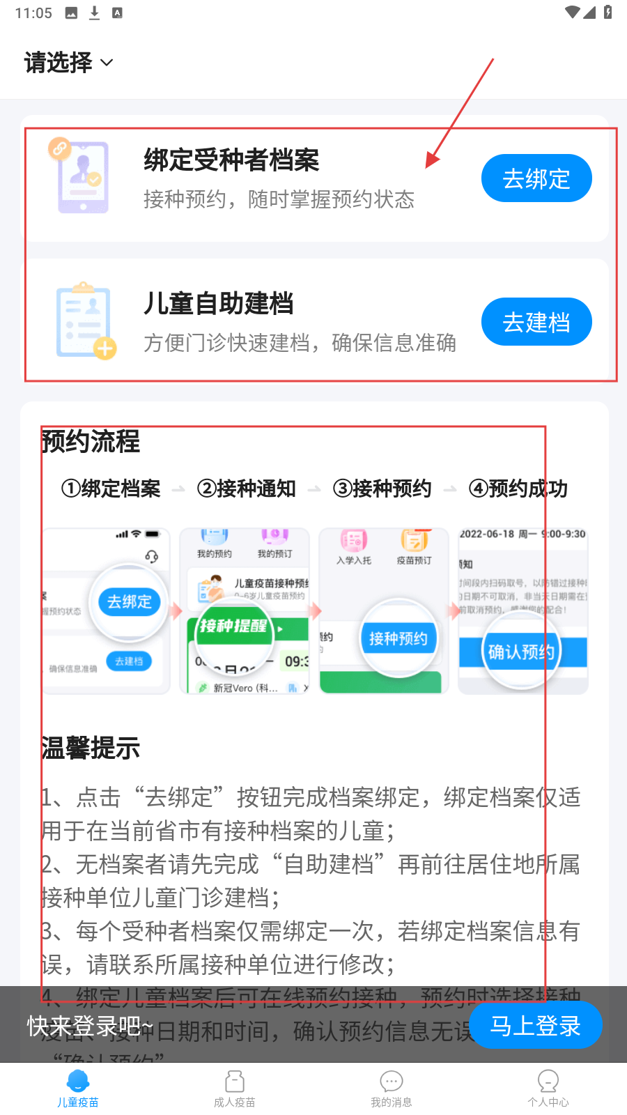 1、在儿童疫苗页面,可选择【绑定受种者档案】或【儿童自助建档】,还能查看预约流程和温馨提示。
