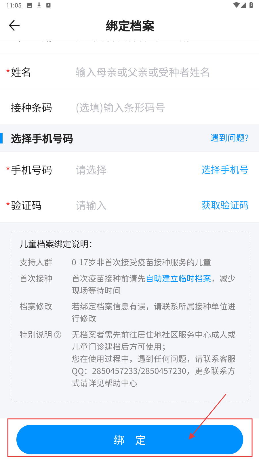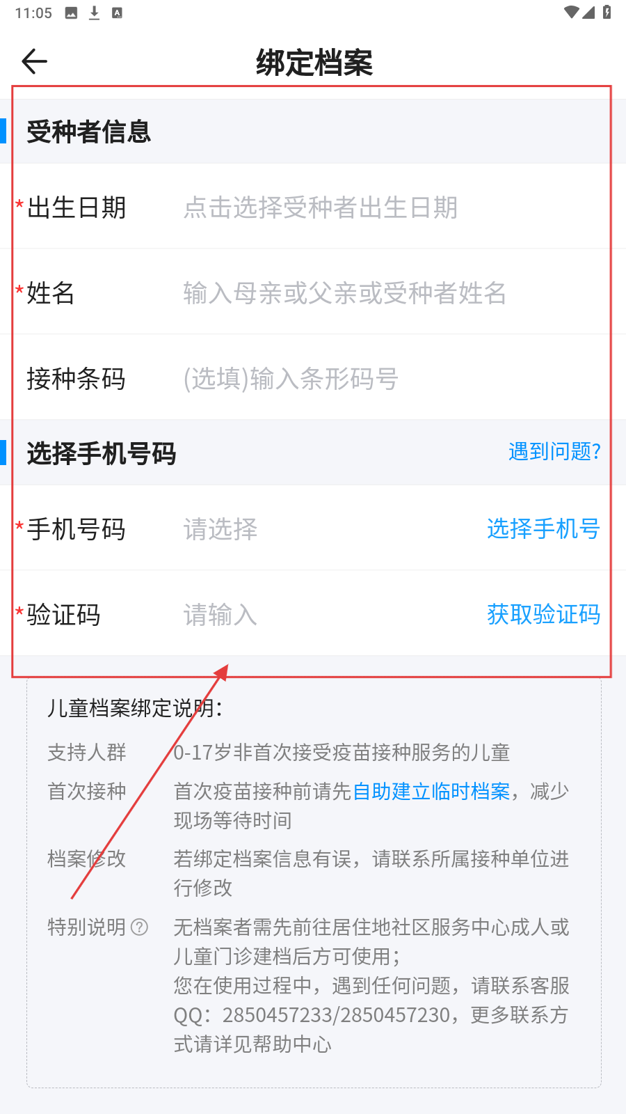 2、进入绑定档案页面,填写【受种者信息】和【手机号码】等内容。