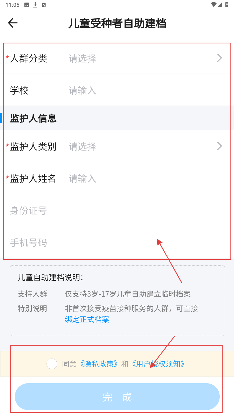 4、进入儿童受种者自助建档页面,填写【人群分类】【监护人信息】等内容,勾选同意相关协议后,点击【完成】按钮,完成自助建档。