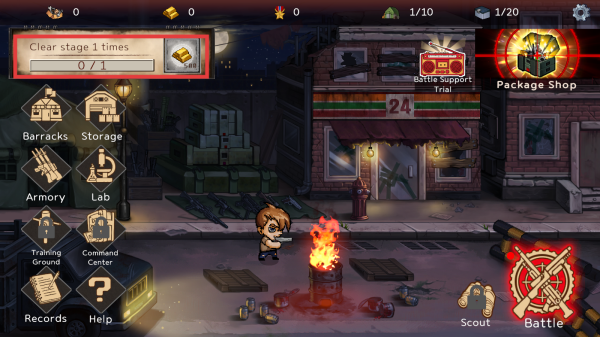 1、优先完成【Clear-stage-1-times】任务,获取500金币奖励,解锁更多功能建筑,为基地发展积累资源。