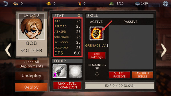 3、熟悉【Bob】的属性面板,掌握【ATK】、【ATKSPD】等数值,战斗中适时释放【Grenade-LV.1】技能,增强输出能力。