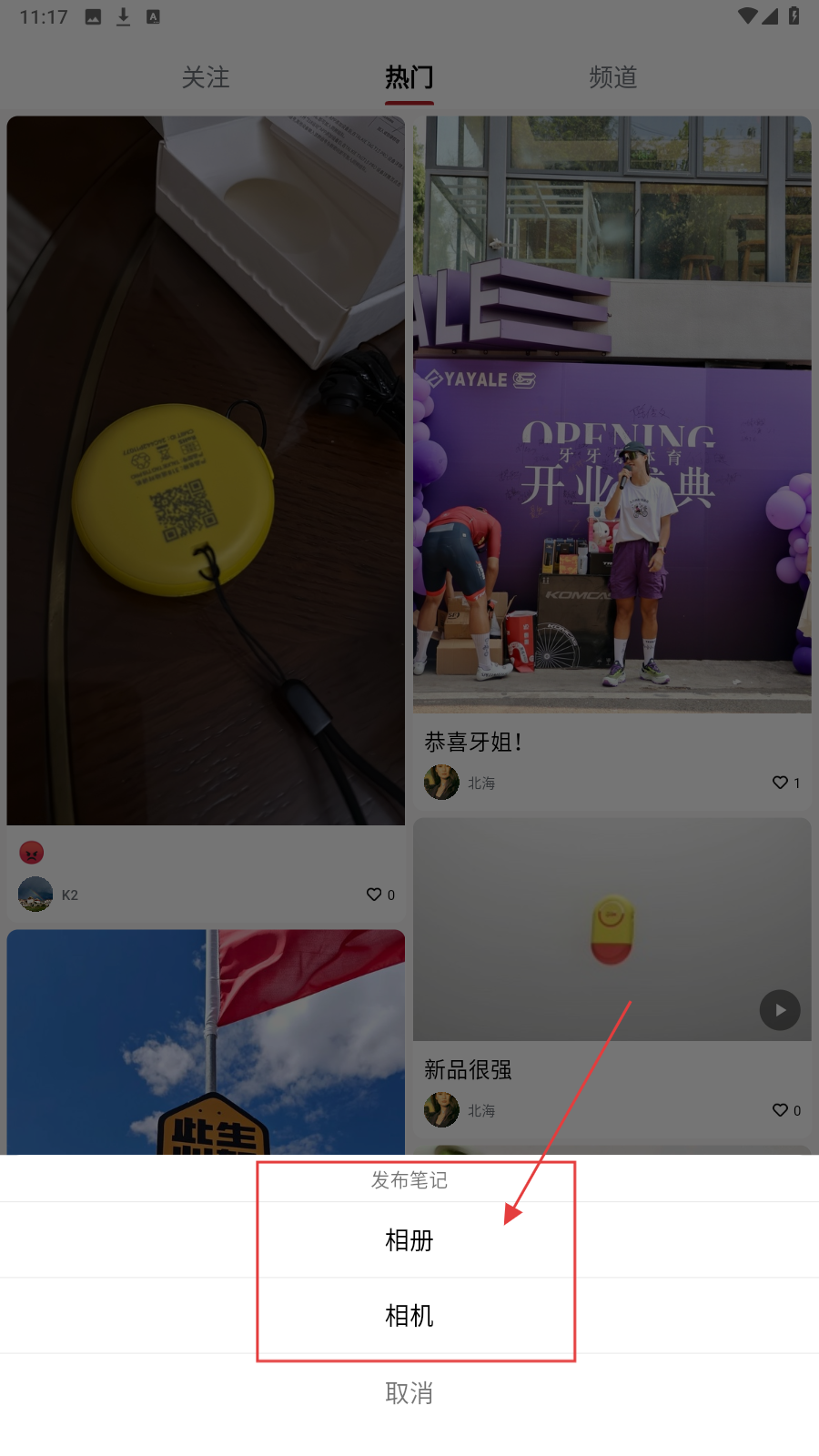 3、点击下方【+】按钮,在【发布笔记】弹窗中选择【相册】或者【相机】并点击。