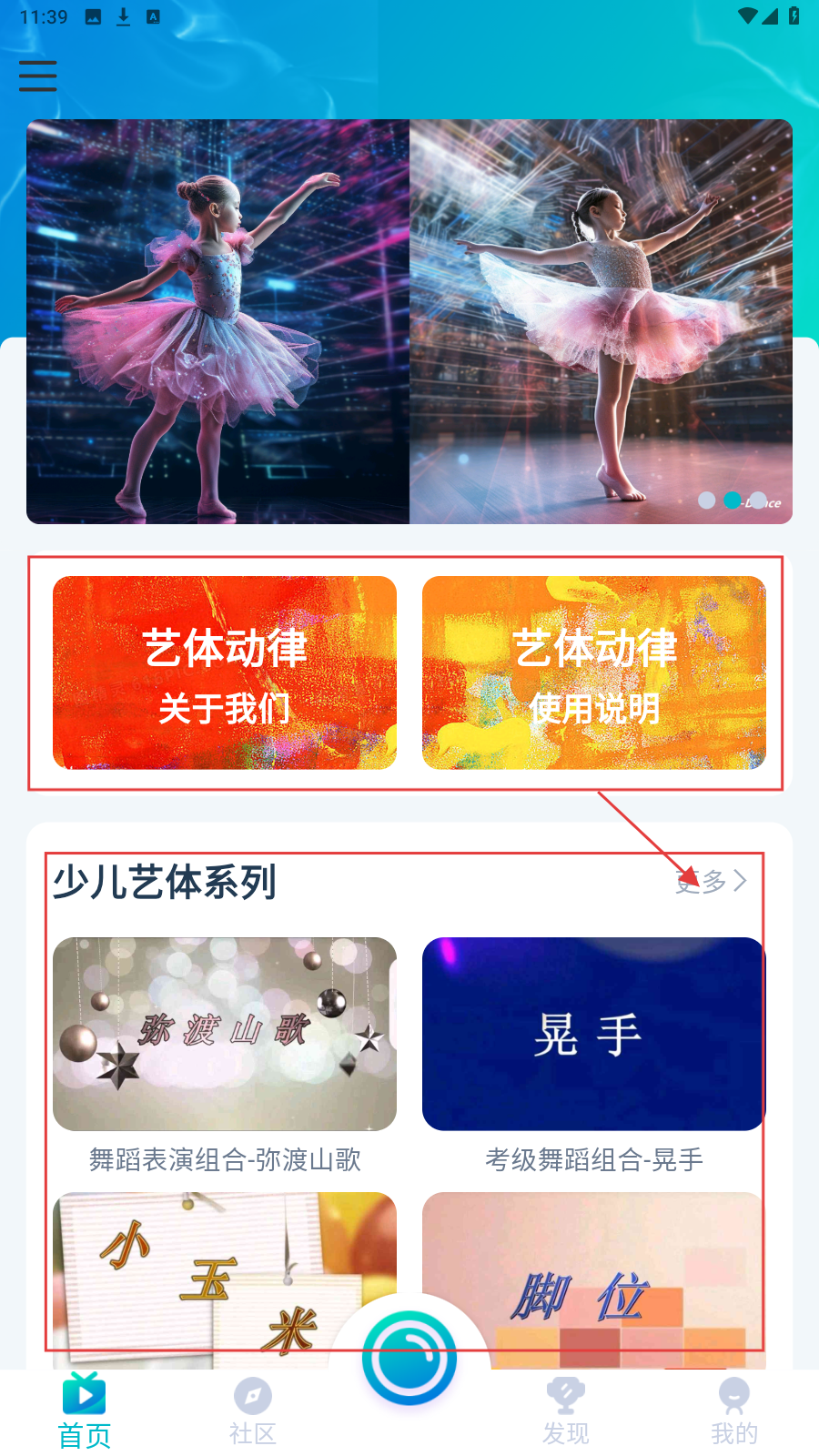 1、在首页可查看【艺体动律】相关介绍和使用说明,还能浏览【少儿艺体系列】舞蹈课程。