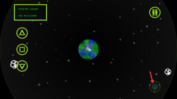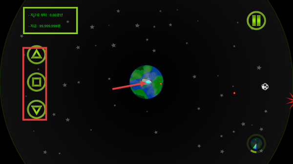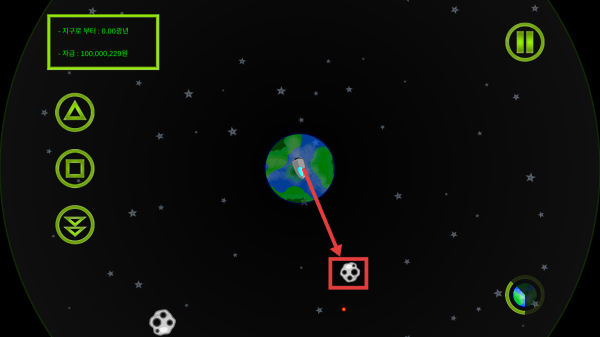 1、熟悉左侧的绿色三角形、方形、倒三角形操控按钮,利用它们灵活控制飞船的飞行方向与操作。
