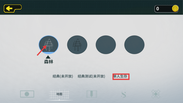 1、选择【森林】场景的【单人生存】模式进入游戏,了解初始金币为0,合理规划资源获取策略。