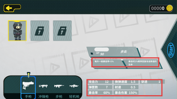 2、熟悉【步兵】角色属性,利用角色特性,优先升级提升生存能力,根据武器属性选择合适时机切换武器。