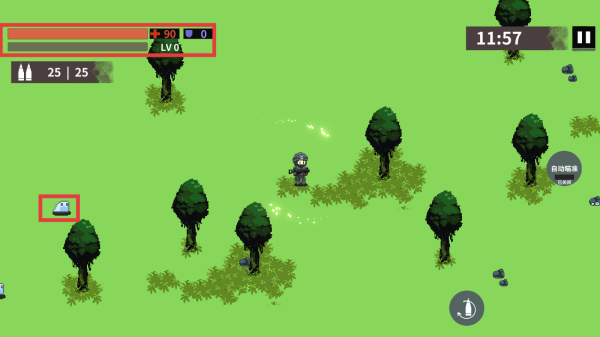 3、关注左上角的【HP】和【LV】,及时补充弹药,利用树木等地形躲避敌人攻击,注意小地图标识提前预判敌人位置。