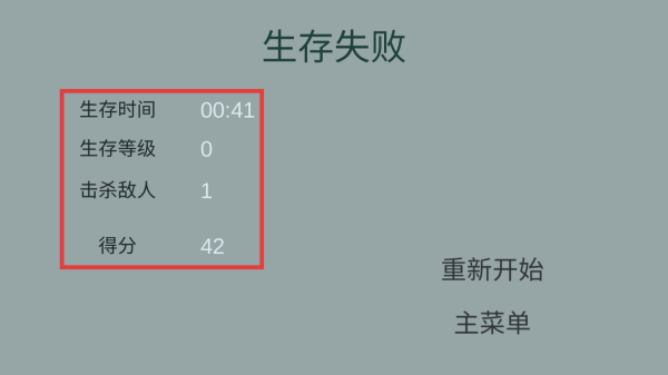 4、生存失败后,查看【生存时间】【生存等级】【击杀敌人】【得分】数据总结经验,可选择【重新开始】再次挑战。