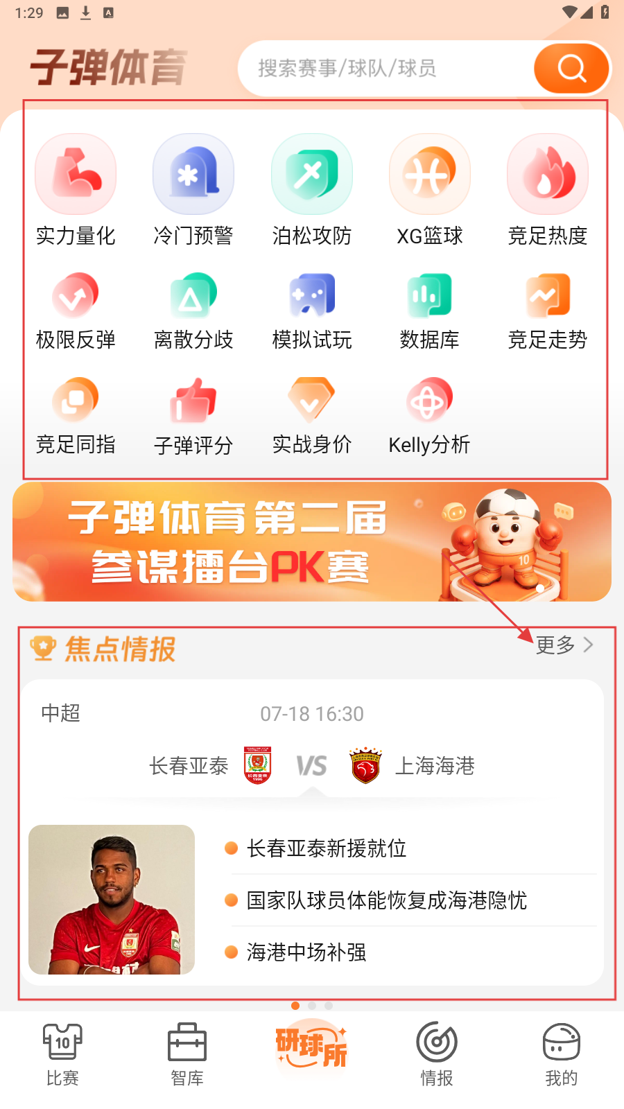 1、打开子弹体育应用,可使用【实力量化】【冷门预警】等功能,还能查看焦点情报,了解赛事相关信息。