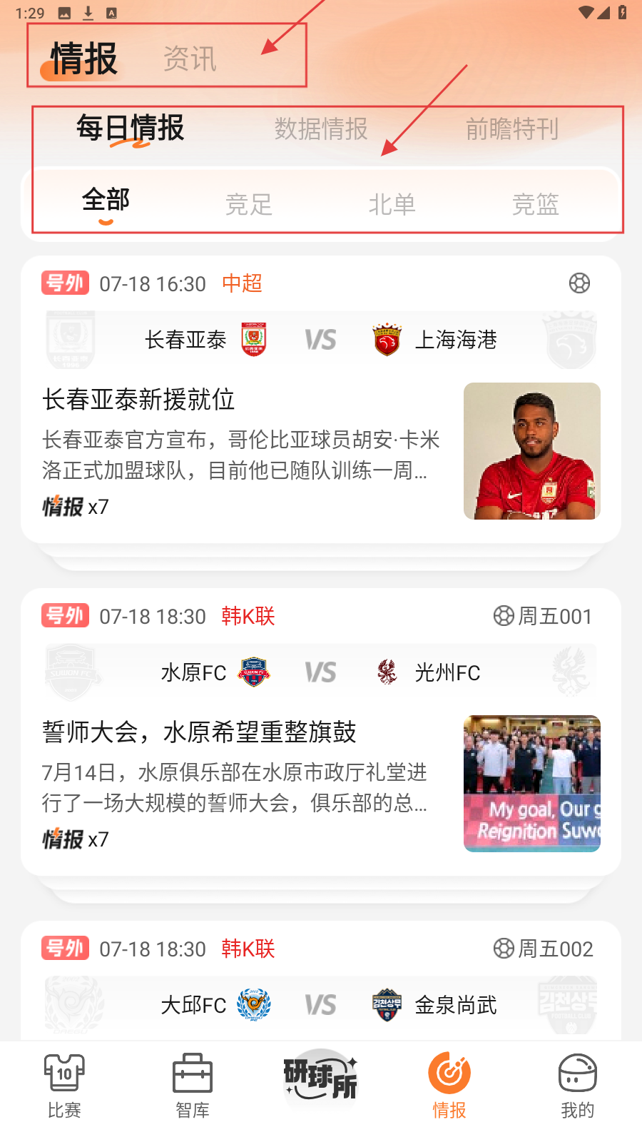 2、进入情报页面,可查看每日情报、数据情报等内容,还能浏览竞足、北单等赛事信息。