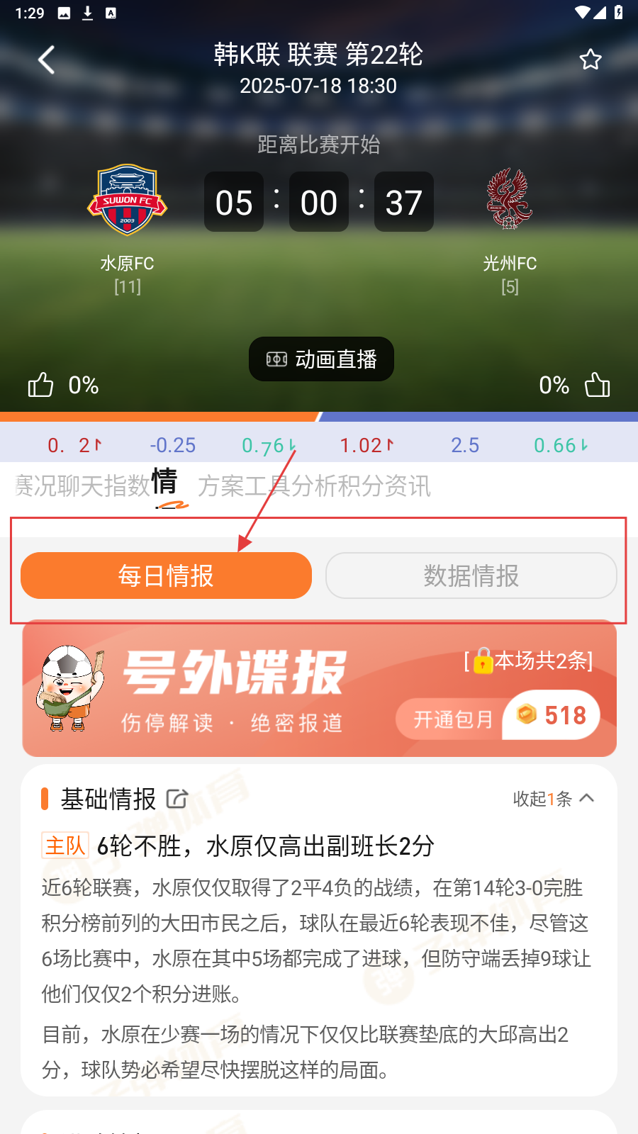 3、进入赛事详情页面,可查看比赛时间、对阵双方等信息,点击【每日情报】按钮,可查看该赛事的每日情报内容。
