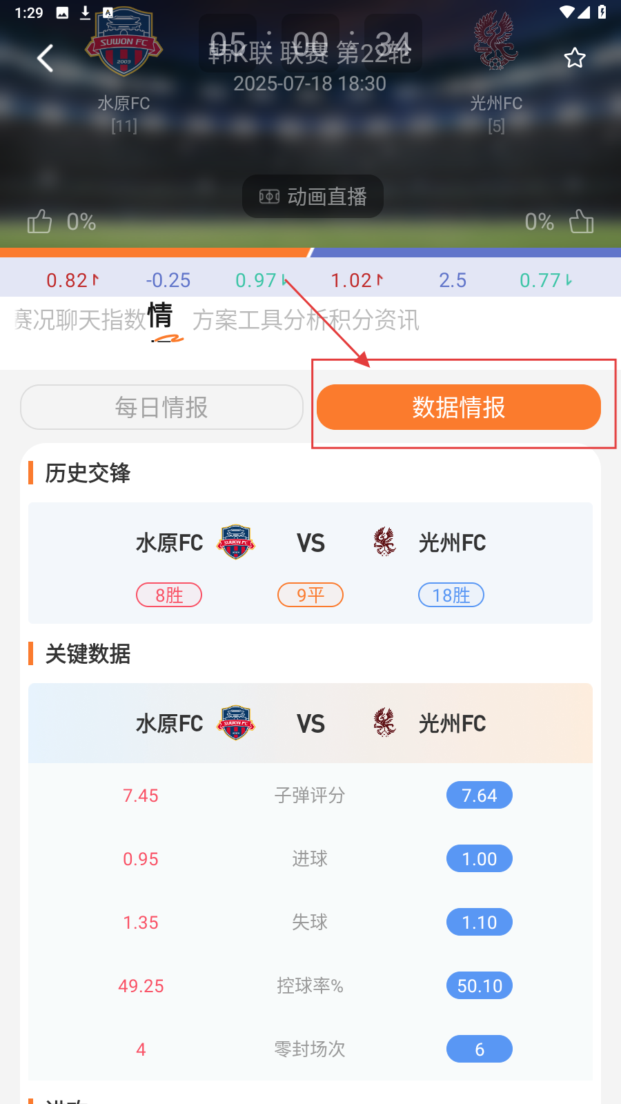 4、在赛事详情页面,点击【数据情报】按钮,可查看该赛事的历史交锋、关键数据等内容,获取赛事相关数据信息。