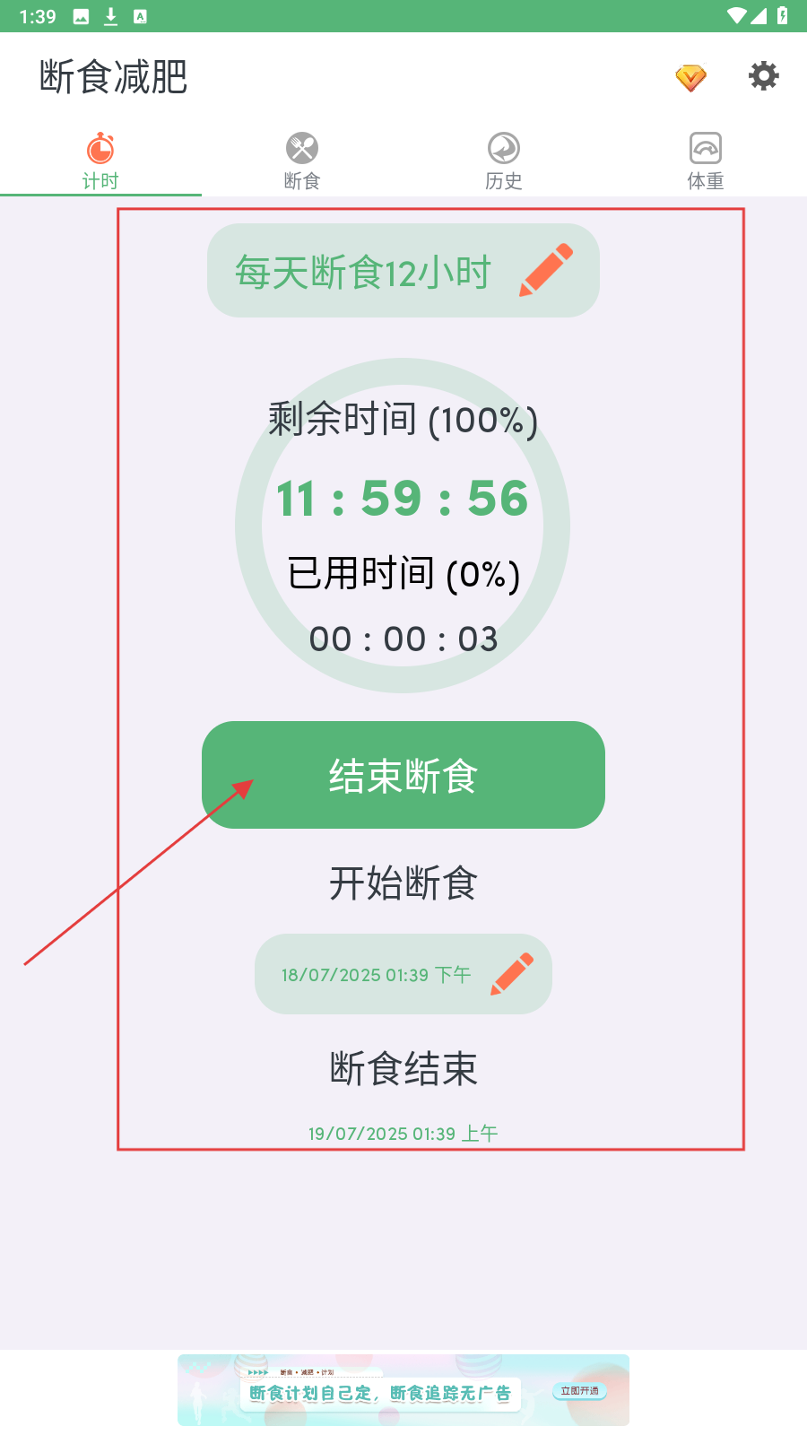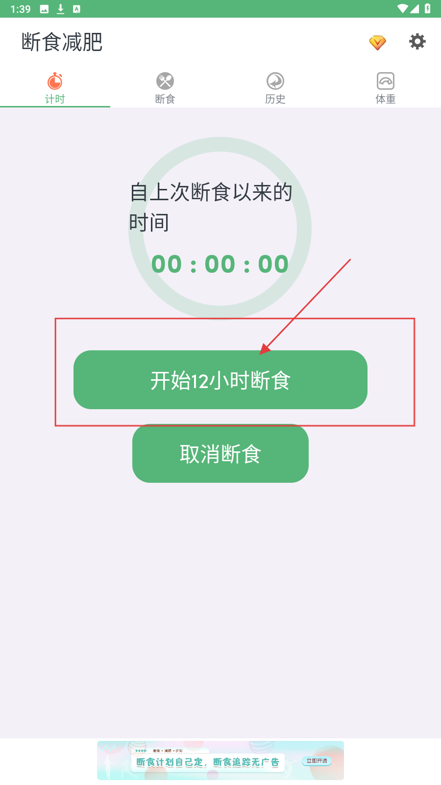 1、打开断食减肥应用,点击【开始12小时断食】按钮,可开始12小时断食计划。
