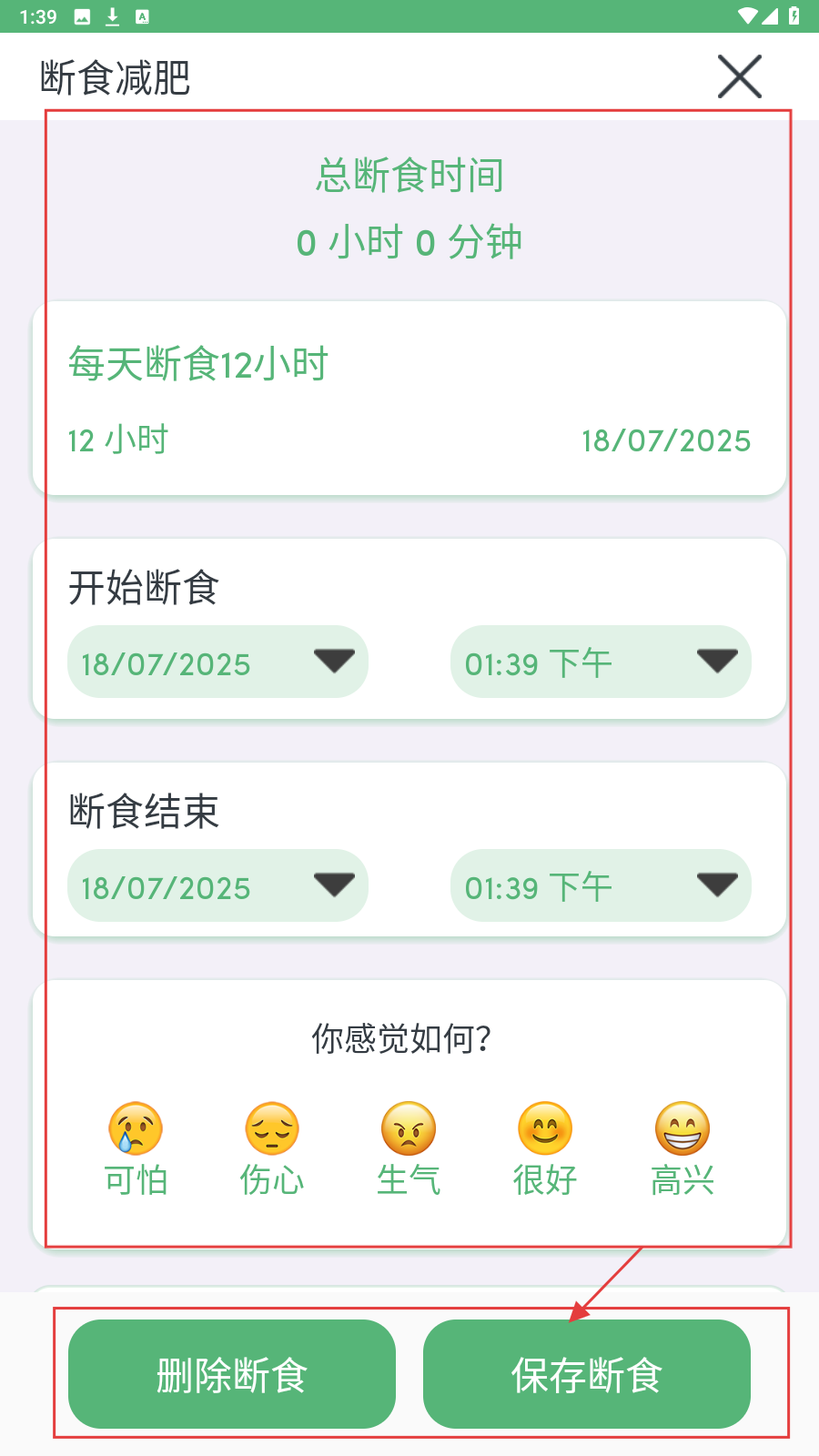 3、断食结束后,可记录断食感受,选择相应的表情图标,点击【保存断食】按钮,保存断食记录。