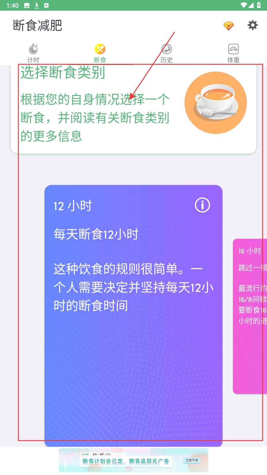 4、在断食类别选择页面,可选择【12小时】【16小时】等断食类别,查看相关断食规则和信息。