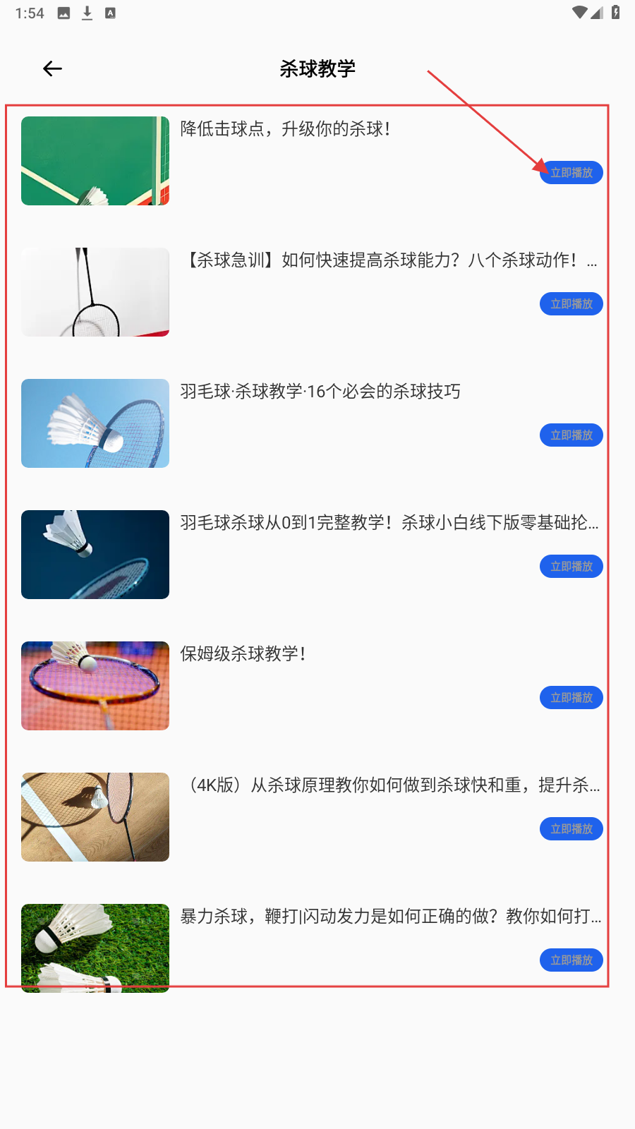 2、进入杀球教学页面,可查看多个杀球教学视频,点击【立即播放】按钮,可播放视频进行学习。