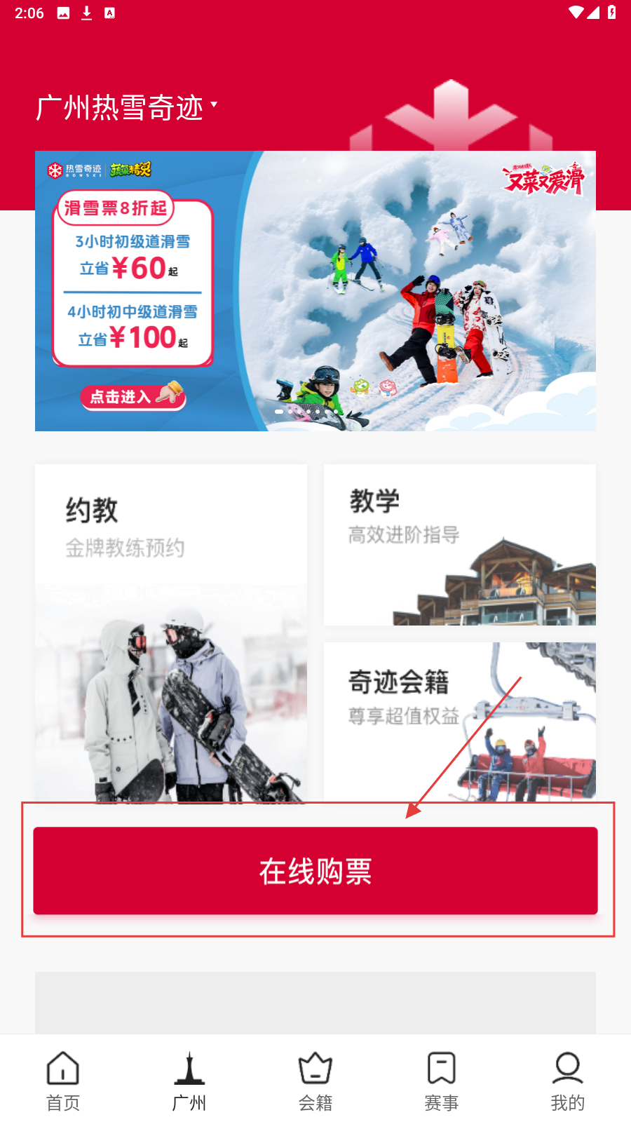 1、进入热雪奇迹主界面,点击醒目的【在线购票】按钮,开启滑雪票预订流程。