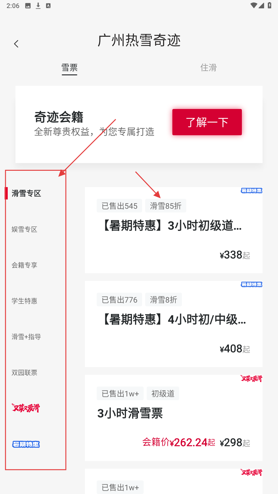 2、在购票页面,选择【滑雪专区】,可看到多种滑雪票优惠活动,如【滑雪85折】等。