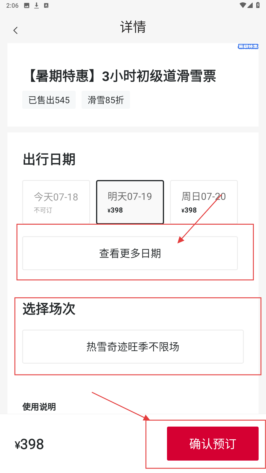 3、进入票种详情页,先选好出行日期,再选场次,最后点击【确认预订】完成购票。
