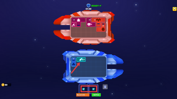 1、飞船建造阶段:摆放基础模块构建攻击防御阵列,依据战术需求优化位置布局形成初始作战能力。