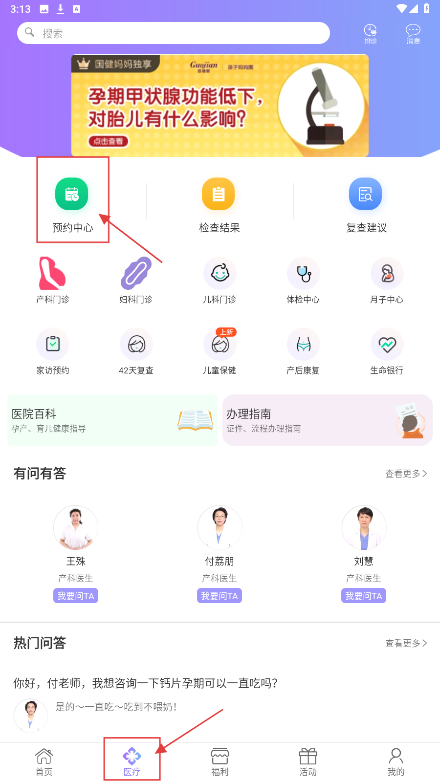 1、进入【医疗】板块,可找到【预约中心】,方便进行产检等医疗相关预约操作。