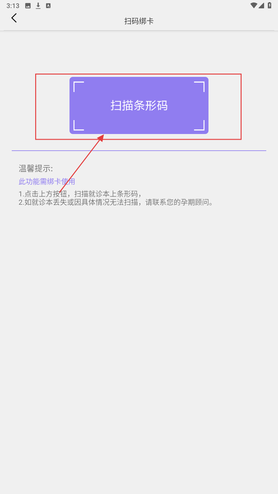 3、进行【扫码绑卡】时,点击【扫描条形码】,按提示操作,若遇问题联系孕期顾问。