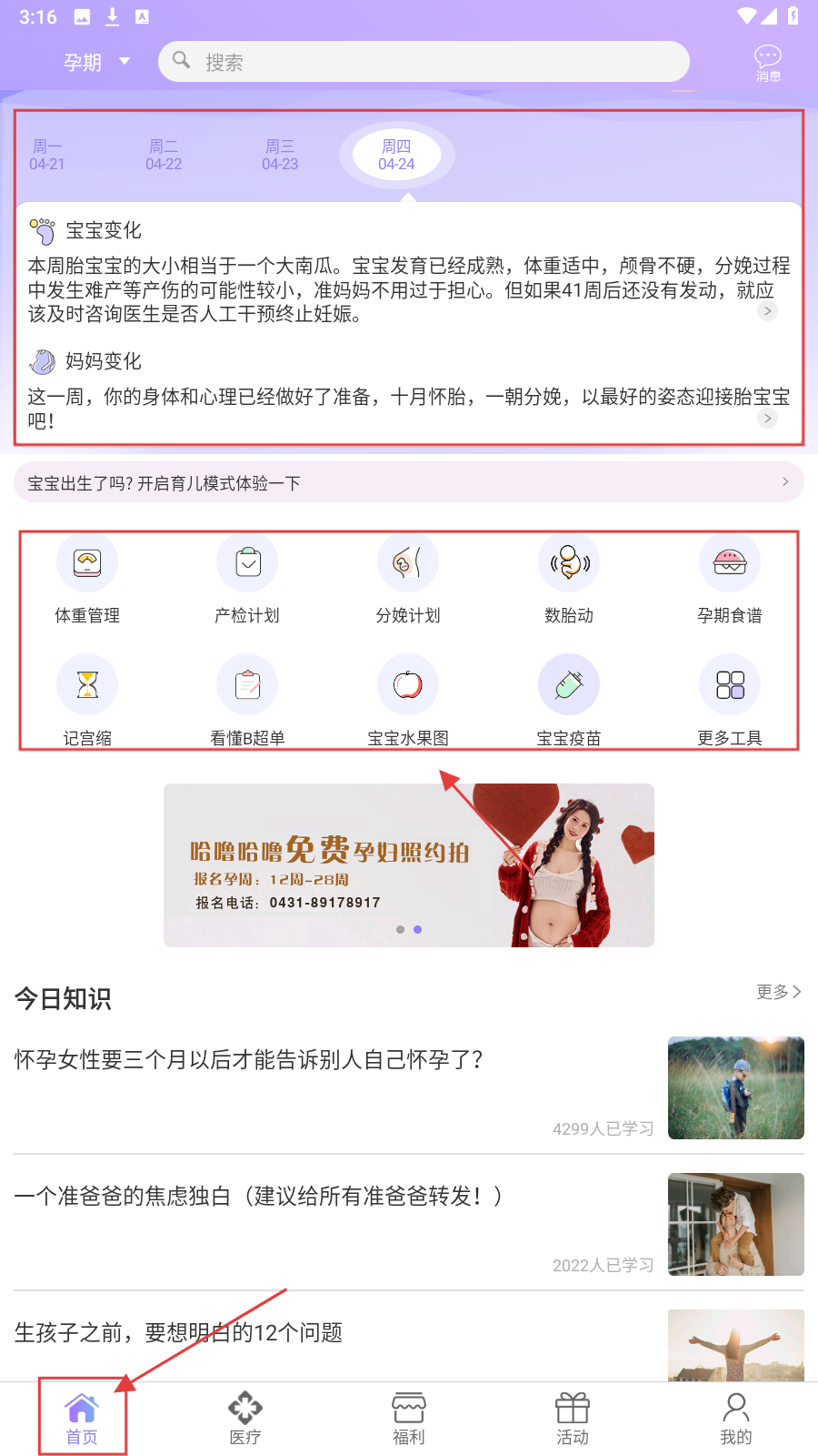 4、回到【首页】,可查看孕期不同阶段宝宝和妈妈变化,还能使用体重管理等工具。
