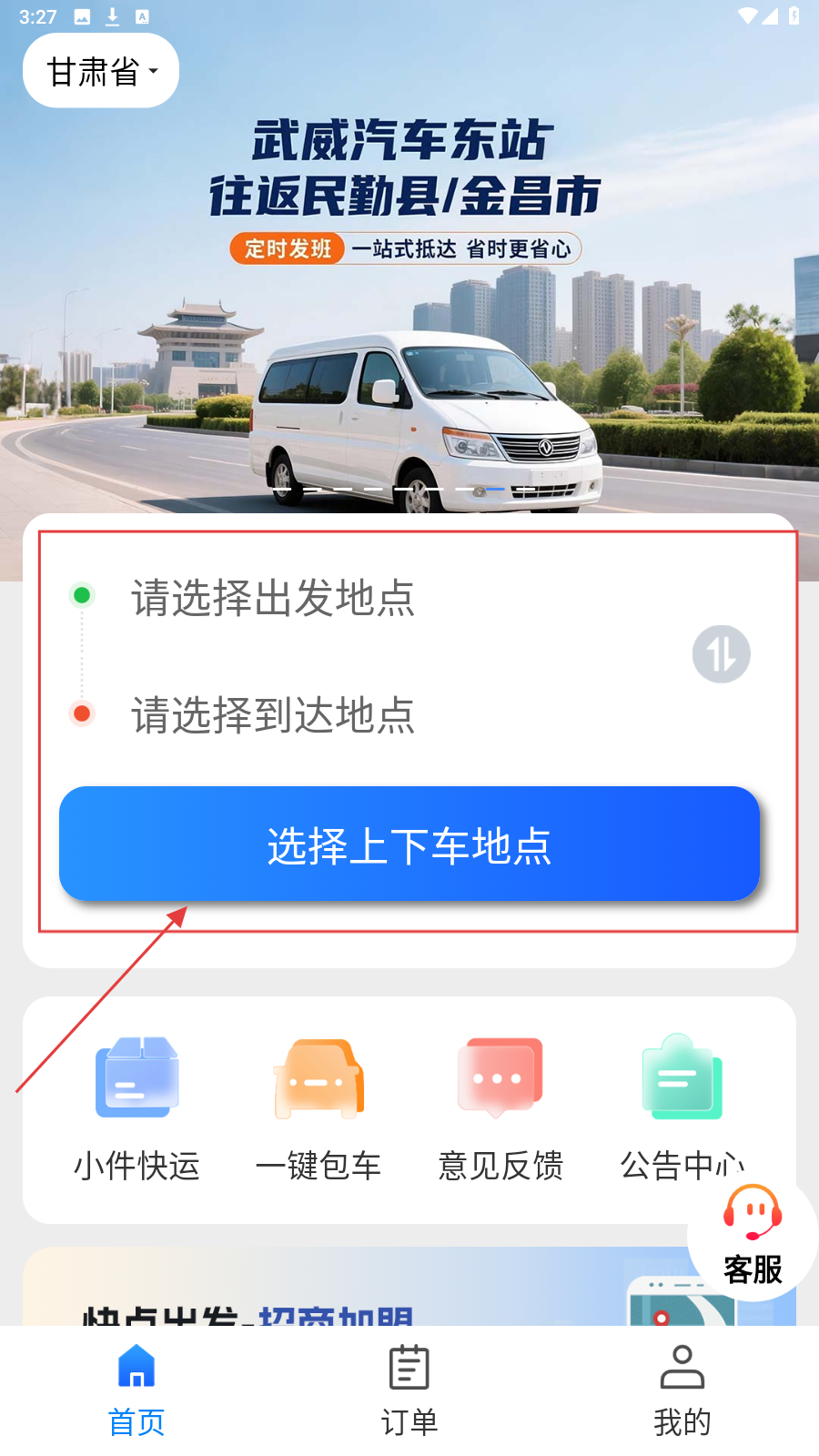 1、进入首页后,点击【选择上下车地点】,开启行程规划第一步。