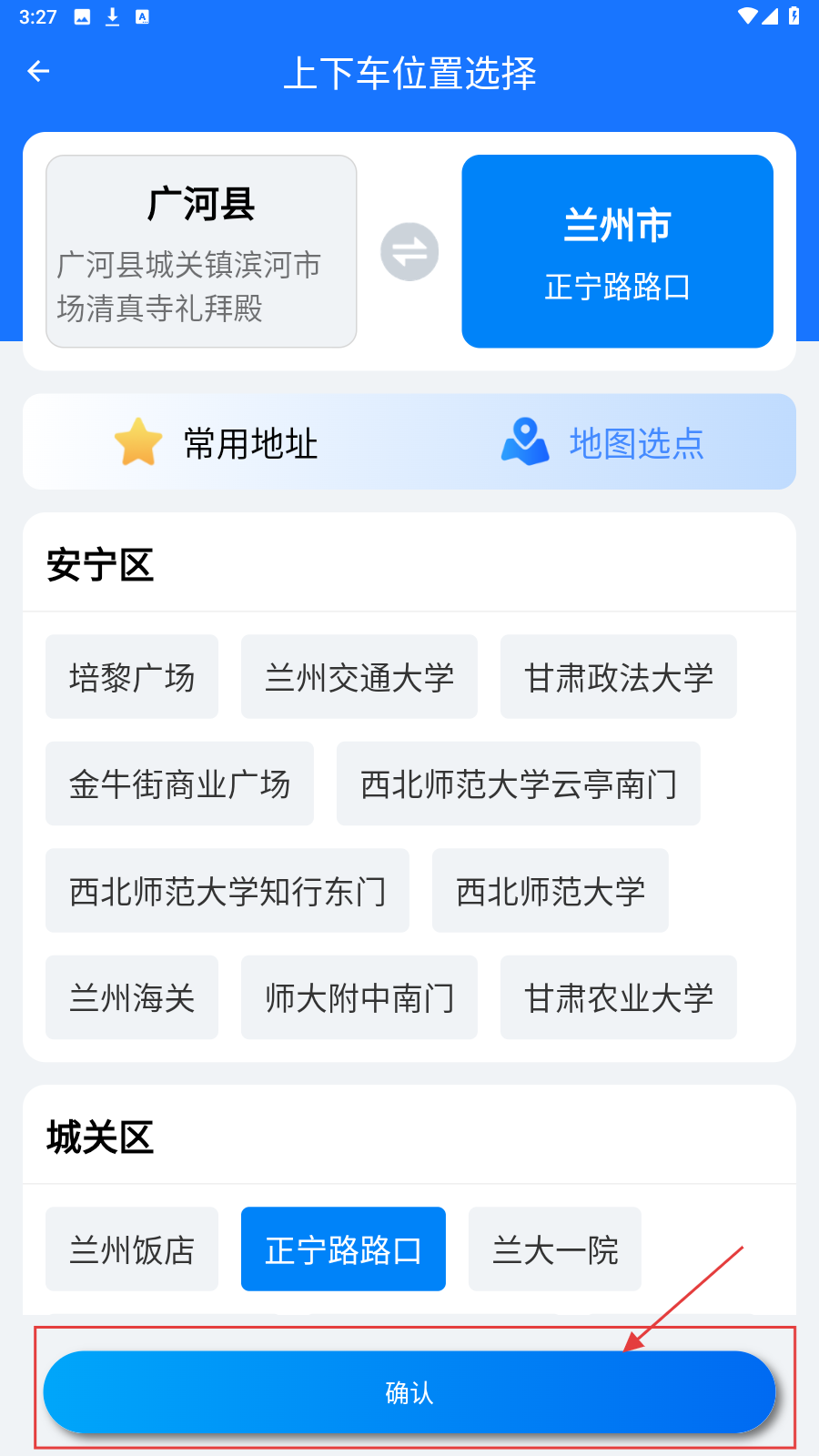 2、在上下车位置选择页面,选好出发地和目的地后,点击【确认】。